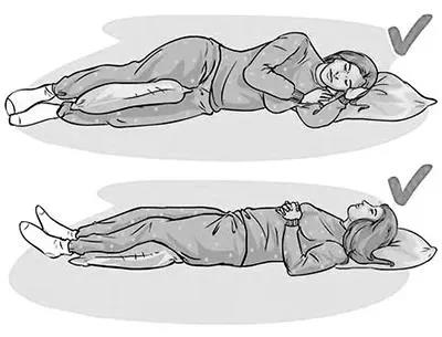 ཟུར་དུ་ལོག་ནས་ཉལ་བ་དང་ཁ་སྦུབ་ཏུ་ལོག་ནས་ཉལ་བ། མཛེས་མའི་ཉལ་སྟངས་ཚང་མ་ཡིས་རྐེད་པ་ལ་གནོད་པ་ཡིན།